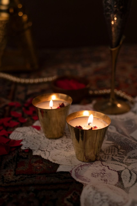 Fill your your space with this beautiful rose aroma from the house. Our beautifully handcrafted brass soy candle complements the festive mood and spruce up your space instantly with a stunning decor. These candles can be placed in multiple corners of your house to elevate that area and also with love and gratitude. It has dried rose and little glitter, perfect for a decor that will add charm to its mood, wherever placed.